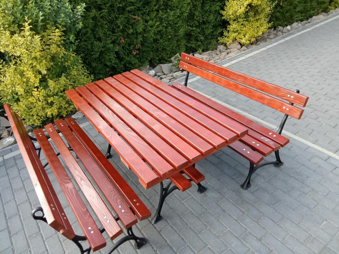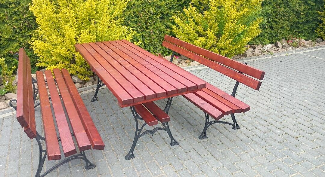 Sprzedam meble ogrodowe królewskie na żeliwnych nogach drewno świerkowe strugane 4 stronie po suszarni. Szerokość 200 cm, malowane lakierobejca w dowolnym kolorze. Wystawiam fakturę cena brutto za komplet 2 ławki stół 200 cm. Wysyłam za pobraniem na palecie 240 zł lub odbiór osobisty.Krystian